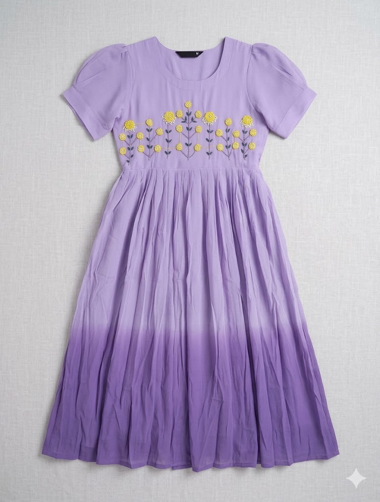 Featuring a stunning ombré transition and delicate floral hand-embroidery on the bodice, this frock is designed for celebrations, festive gatherings, and making memories.